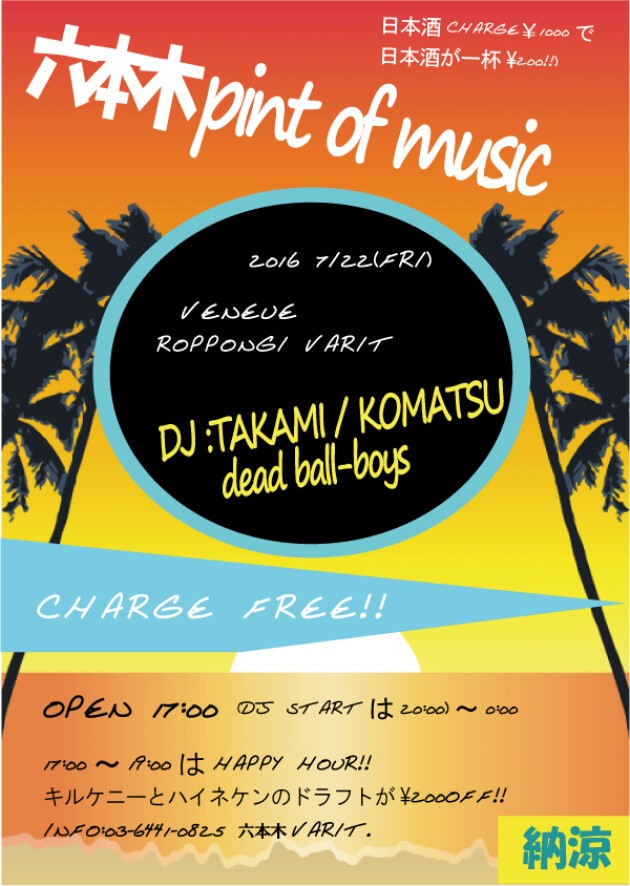 にて新たに立ち上げたあくまで終電まで盛り上がれるparty 「六本木pint of music」いわゆる音楽箱が減ってきている六本木にて、テクノ,ハウスの枠に収まらず、