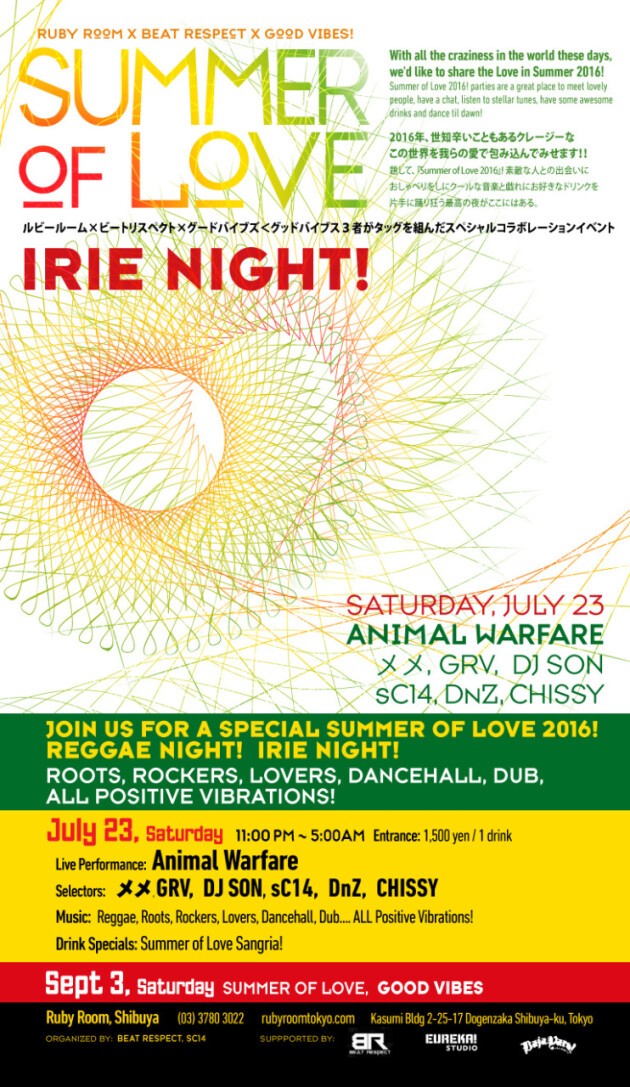 Summer of Love 2016! parties are a great place to meet lovely people, have a chat, listen to stellar tunes, have some awesome drinks and dance til dawn! 2016年、世知辛いこともあるクレージーなこの世界を我らの愛で包み込んでみせます!! 題して、『Summer of Love 2016』! 素敵な人との出会いに、おしゃべりをしに