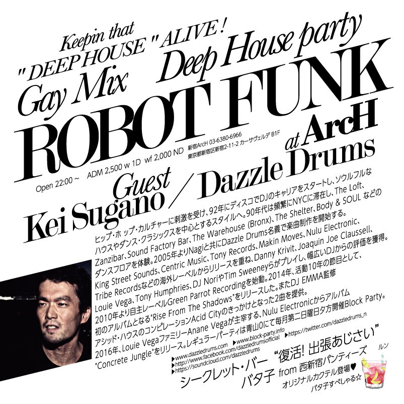 2丁目発信!!!『ROBOT FUNK』。時代とともに形をかえつつもDEEP HOUSEにこだわり続け、人種セクシャリティ性別を超え、TOKYO DEEP HOUSE シーンでは熱狂的指示を得ているOkamatique house all night long!!!