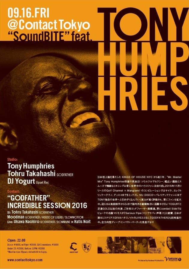 Legendary underground club Zanzibar is known for its historical achievement along with the Paradise Garage in the ‘80s deep disco culture leading up to the US house. 25 miles away from the latter, it inherited the legacy of garage sound, laying the foundation for the so-called New Jersey sound and channeling its spirit and sound into the ‘90s house. It all comes down to a DJ that makes the first appearance at Studio, Tony Humphries. Sharing the stage is Toru Takahashi. The Japanese counterpart, who brought the garage sound back to the Far East in the ‘80s, joins forces with DJ Yogurt to weave a thread that runs through the past and the present of the genre. He is also at the helm of the Contact floor, leading beloved deep house collective Godfather with Moodman and Naohiro Ukawa to offer a special incredible session.