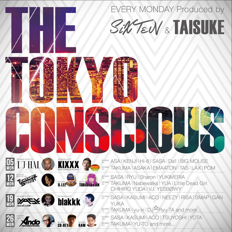 毎週月曜日開催の【THE TOKYO CONSCIOUS】Apparel・美容師関係者などクラブシーンのみならず多くの流行に敏感なオーディエンスが集うハイセンスな一夜。最新オールミックスのフロアに加えエッジの効いたBASS MUSIC/Hip Hopを中心としたフロアの2フロア構成で全てのお客様に「リアルな東京」を楽しんで頂けます。