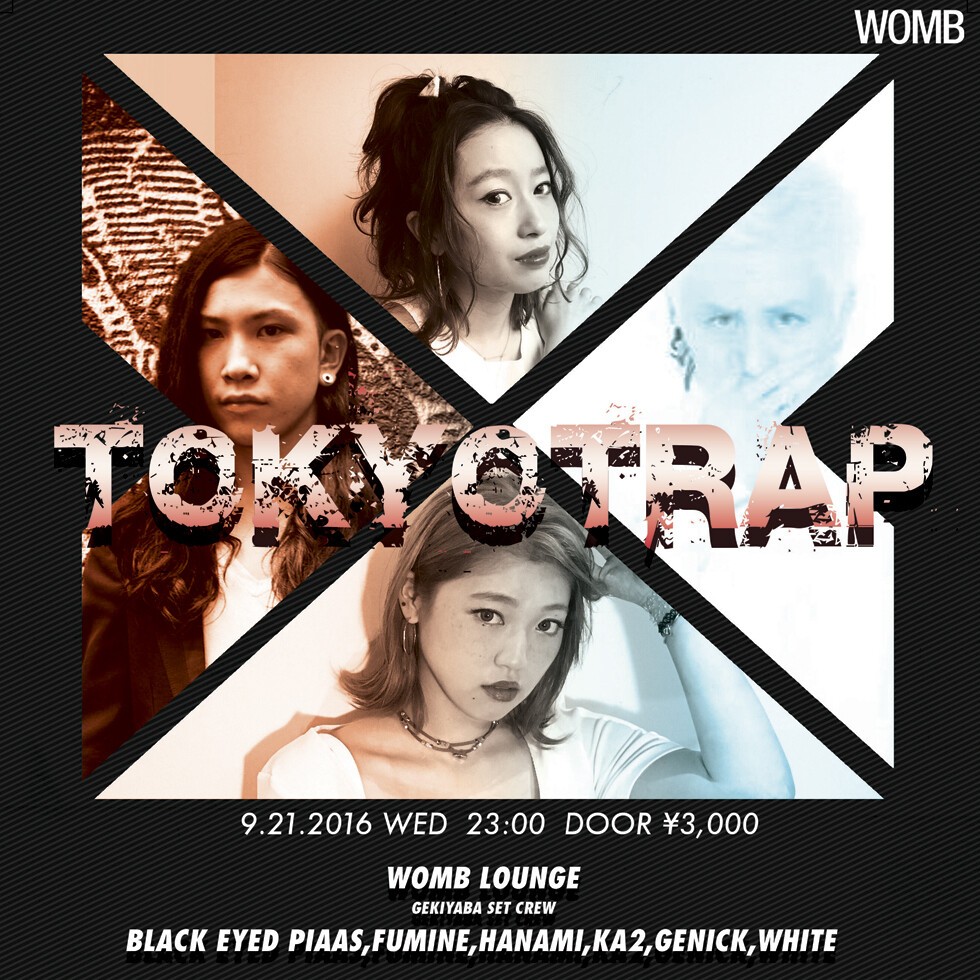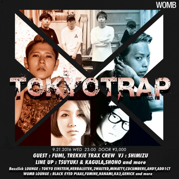 FUMI や TREKKIE TRAX を筆頭に最先端の TRAP、BASS MUSIC が堪能出来るパーティー TOKYO TRAP を開催。東京クラブシーンの若年層からの圧倒的な支持を受け、年間250本以上のギグをこなし、その活動は東京にとどまらず、大阪、名古屋、京都、福岡など各都市でもゲスト出演し、最近では2016年7月に最先端の TRAP を主とした BASS MUSIC が楽しめる MIX CD “MUSIC BOXXX” をリリースした FUMI。そして、レーベル発足よりこれまで50作品を超える作品をリリースし、その楽曲のクオリティーの高さは日本だけでなく世界中から賞賛を受け、これまで Skrillex、Diplo、Major Lazer、RL Grime、Djemba Djemba、MUST DIE!、Ookay、Carnage、Mija、Wave Racer など名だたる DJ 達からサポートを受け、2015年に開催された ULTRA JAPAN 2015 では、メインフロアで数多くの楽曲がプレイされ、レーベルアーティストが2名も出演するなど大注目の TREKKIE TRAX。 この2組を中心に、WOMB 全フロアでリアルな東京のシーンで活躍する DJ 陣が集結する!今後もTOKYO 最先端のこのパーティーから目が離せない。