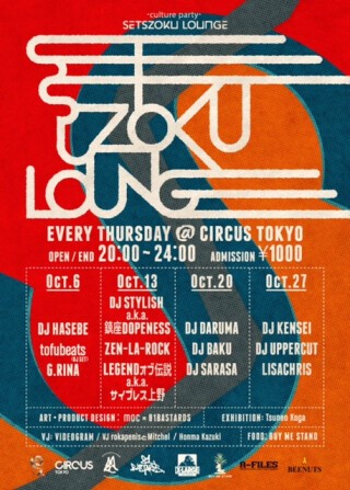 カルチャーパーティー”SETSUZOKU”のラウンジイベント「SETSUZOKU LOUNGE」が”CIRCUS TOKYO”にて10月から11月まで毎週木曜日に開催決定!そして12月のスペシャル開催へと続きます。様々なカルチャーを共有する場所として、年齢・性別を問わず高い感性を持つ人々・独自の世界観を持つ人々が交差する感度高めな夜を演出!