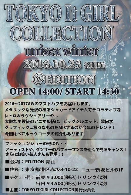 2016年10月23日(日)に東京都港区にある「EDITION 青山」にて、東京イットガールコレクション ~unisex winter~を開催いたします。