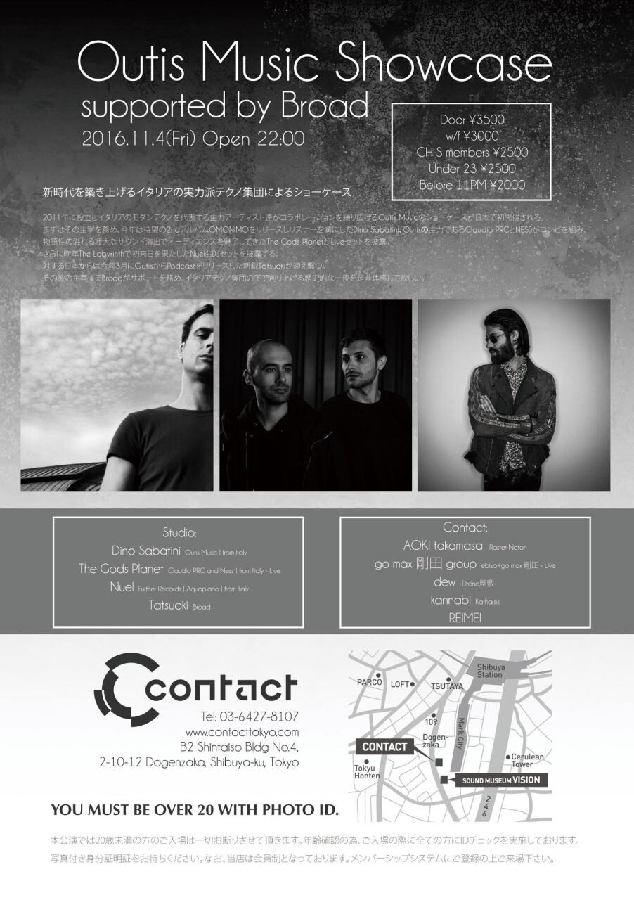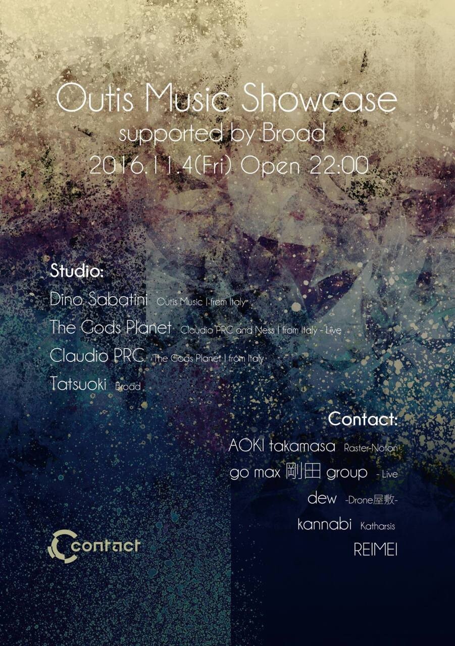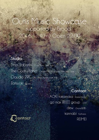 イタリアからベルリン、今では世界を股に掛けて、2010年以降のモダンテクノを最前線にて牽引するDino Sabatiniが主宰レーベルOutis Musicを率いて日本に襲来する。Dino Sabatiniは今年4月に発表したセカンドアルバム「OMONIMO」にて、決してフロアのみに従属することのないテクノの瞑想的なヒプノシスと、独特の感性で神秘的なまでに磨かれた音のメロウネスを発揮。自らの深化をシーンに映し出すことにより、2016年現在のテクノを新たな地平へと導いている。また今回は、サルディーニャ出身であること含め、同様のバックボーンと音楽的イデオロギーを標榜するClaudio PRCとNessによるコンビで、物語性の溢れる壮大なサウンド演出でこれまでも日本のオーディエンスを魅了してきたThe Gods Planetがライヴセットを披露。さらに、Claudio PRCはDJセットでもメインフロアに登場する。そして日本初開催となるOutis Musicのショーケースのサポートには、今年3月に同レーベルにPodcastを提供した新鋭Tatsuokiが独自の論理思考に基づいて主宰しているイベント「Broad」が名乗りを上げ、昨年末、代官山AIRにDino Sabatiniが所属するユニットModern Headsを迎えた際の組み合わせが新天地Contactでも実現することとなった。さらにContactラウンジにはAOKI takamasaがDJセットで登場することも決まり、ますます特別な一夜になることを予感させる。