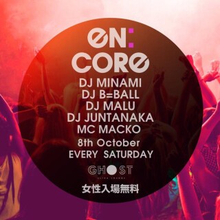 毎週土曜日のGHOSTは大阪のクラブシーンを常に最先端へ引っ張って来たDJ陣を揃え、HIP HOPをベースに"今一番クラブで盛り上がる曲"をオープンフォーマットスタイルでお届けする『EN:CORE』!HIP HOP好きのアナタはもちろん、海外のクラブシーンを追いかけるSoundCloud中毒のアナタもきっと満足できる、唯一無二の内容でアメ村の土曜日の夜を彩ります。
