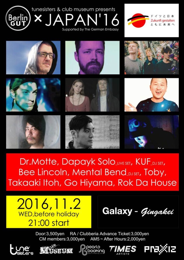 ベルリン⇔東京の架け橋となるテクノイベント『BerlinGut×JAPAN'16』!ドイツからは、ラブパレードの創設者Dr.Motteを筆頭に、Dapayk Solo、KUF、Bee Lincoln、Mental Bendの5組が来襲。日本からはテクノ外交官Tobyを始め、Takaaki Itoh、Go Hiyama、Rok Da Houseの4名が迎え撃つ!