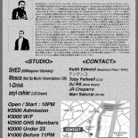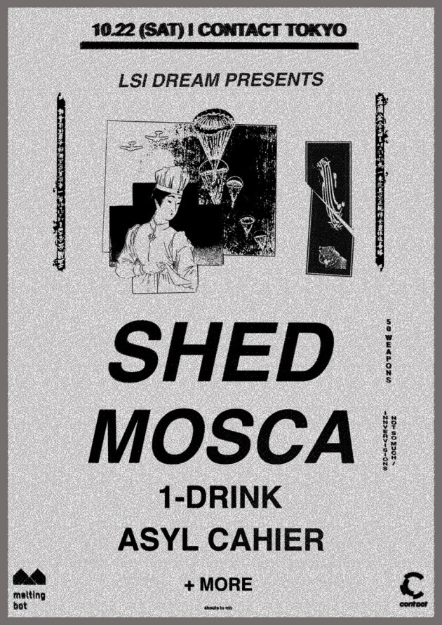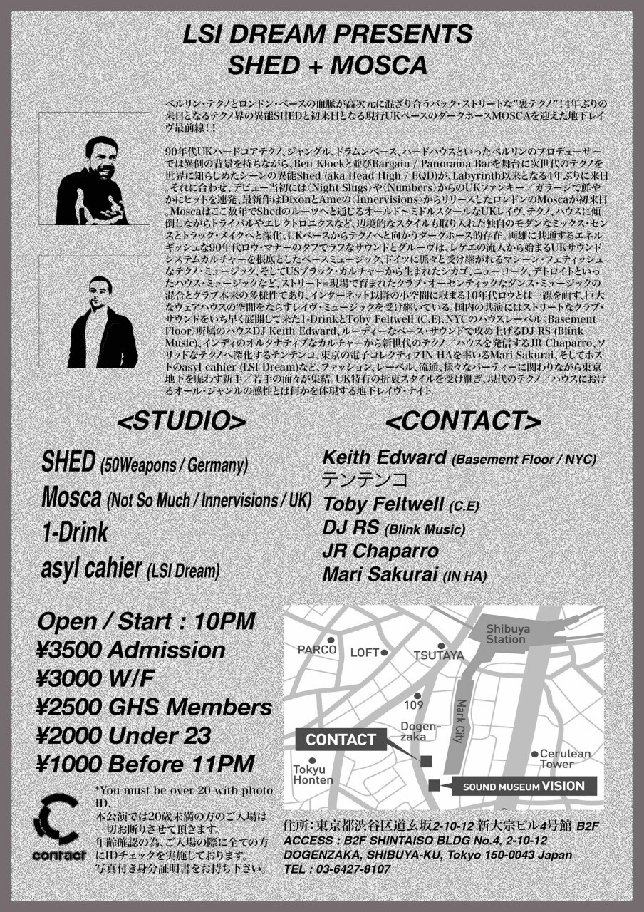 90年代UKハードコアテクノ、ジャングル、ドラムンベース、ハードハウスといったベルリンのプロデューサーでは異例の背景を持ちながら、Ben Klockと並びBargain / Panorama Barを舞台に次世代のテクノを世界に知らしめたシーンの異能Shed (aka Head High / EQD)が、Labyrinth以来となる4年ぶりの来日。それに合わせ、デビュー当初にはNight SlugsやNumbersからのUKファンキー/ガラージで鮮やかにヒットを連発、最新作はDixonとAmeのInnervisionsからリリースしたロンドンのMoscaが初来日。Moscaはここ数年でShedのルーツへと通じるオールド〜ミドルスクールなUKレイヴ、テクノ、ハウスに傾倒しながらトライバルやエレクトロニクスなど、辺境的なスタイルも取り入れた独自のモダンなミックスセンスとトラックメイクへと深化、UKベースからテクノへと向かうダークホース的存在。両雄に共通するエネルギッシュな90年代ロウ・マナーのタフでラフなサウンドとグルーヴは、レゲエの流入から始まるUKサウンドシステムカルチャーを根底としたベースミュージック、ドイツに脈々と受け継がれるマシーンフェティッシュなテクノミュージック、そしてUSブラックカルチャーから生まれたシカゴ、ニューヨーク、デトロイトといったハウスミュージックなど、ストリート=現場で育まれたクラブオーセンティックなダンスミュージックの混合とクラブ本来の多様性であり、インターネット以降の小空間に収まる10年代ロウとは一線を画す、巨大なウェアハウスの空間をならすレイヴミュージックを受け継いでいる。国内の共演にはストリートなクラブサウンドをいち早く展開して来た1-DrinkとToby Feltwell (C.E)、NYCからハウスDJ Keith Edward、ルーディーなベースサウンドで攻め上げるDJ RS (Blink Music)、インディのオルタナティブなカルチャーから新世代のテクノ/ハウスを発信するJR Chaparro、ソリッドなテクノへ深化するテンテンコ、東京の電子コレクティブIN HAを率いるMari Sakurai、そしてホストのasyl cahier (LSI Dream)など、ファッション、レーベル、流通、様々なパーティーに関わりながら東京地下を賑わす新手/若手の面々が集結。UK特有の折衷スタイルを受け継ぎ、現代のテクノ/ハウスにおけるオールジャンルの感性とは何かを体現する地下レイヴナイト。