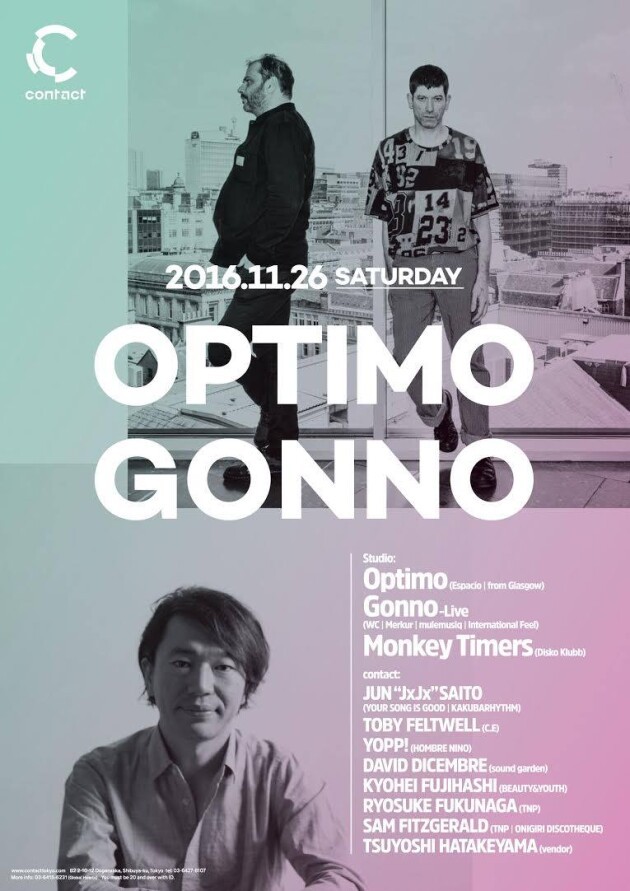 スコットランド最大の都市グラスゴーの音楽文化は決して大規模とは言い難いが、ダンスミュージックのシーンにおいて大きな影響を残してきた事実は、同都市を代表するクラブSub Clubと、JD TwitchとJG WilkesによるDJユニットOptimoが証明している。20年を超えるキャリアの中でそれぞれが発表してきた作品の趣向や、培ってきた技術や知識幅は異なるものの、2人がひと度一体となりDJを行えば、その全てはトレンディかつエッジィな独創的センスへと昇華される。そんな2人がSub Clubにて13年にわたりレジデントを務めてきたパーティーは毎回1000人以上を集め、地元民だけでなく、グラスゴーに訪れた世界中の人々をも恍惚へと導いてきた。今回、共演としてライヴセットを披露するGonnoも、昨年2人に白羽の矢を立てられてSub Clubに招かれた、現地の熱狂を知るひとり。今回のパーティーはGonnoがOptimoを招き返して実現した、親密な一夜となっている。