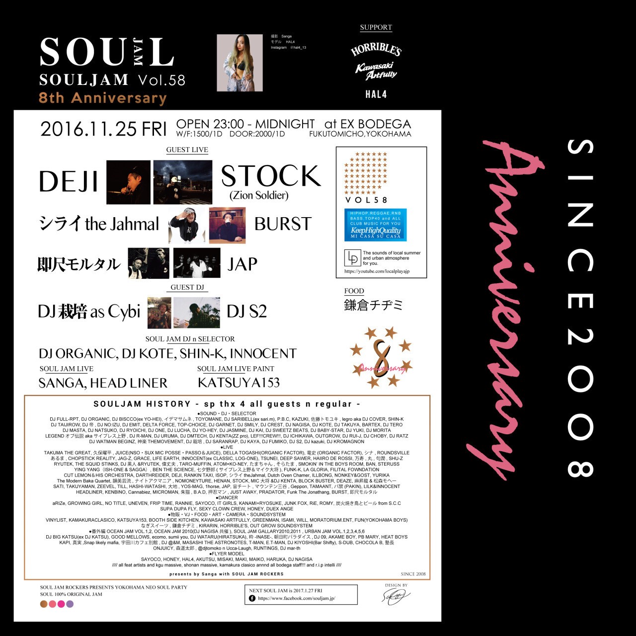 横浜・福富町の老舗箱「cafe ex.Bodega」にて奇数月第4金曜日に開催しているSOUL JAM。HIPHOP、REGGAE、R&BからBASSMUSIC、新譜を中心に旧譜まで流れ、ライブショーケース、ライブペイントなどコンテンツ盛り沢山のジャングルパーティー。毎回、豪華ゲストを招きソウルとソウルがジャムする福富町のピースでオリジナルな夜を提供いたします。