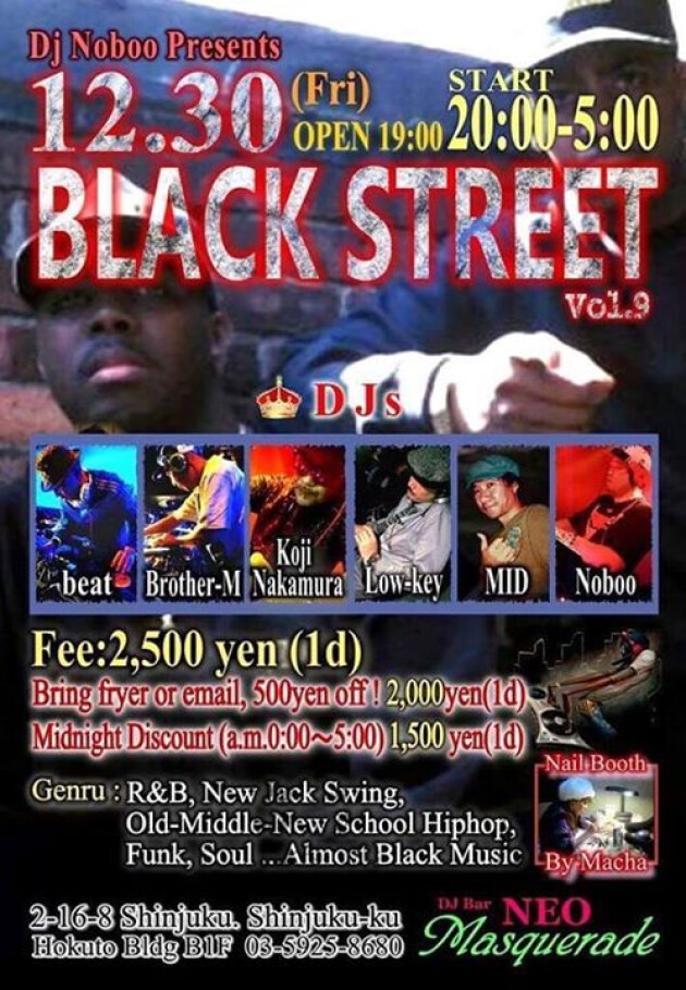 ☆ お待たせいたしました!今年最後のBlackStreet Vol.9開催! 黒いオトとダンスで楽しみましょうということで、総勢6人の豪華Djsで"Black Street Vol.9"をお贈り致します!