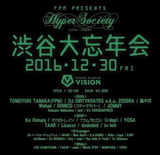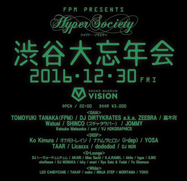 Last HYPER SOCIETY was 50th birthday party for TOMOYUKI TANAKA (FPM) featuring 50 top artists and brought 1300 people to the club. This will be their year end party!