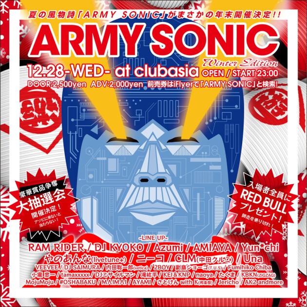 アソビシステムがお届けする夏の風物詩「ARMY SONIC」がまさかの年末開催決定!!アソビシステム所属アーティストを筆頭にゆかりあるDJ陣が盛り沢山で師走の渋谷を盛り上げます。師走の疲れを吹き飛ばすべく入場者全員に「 RED BULL」のプレゼントや、豪華賞品があたる大抽選会も開催!恒例のシークレットゲストも登場なるか!? ARMYを知っている人も知らない人もHAPPYなサウンドに酔い知れる事間違い無しの一夜をお見逃し無く!