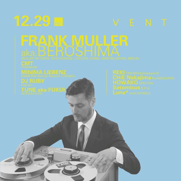 Laurent Garnier、Marcel Dettman、Skudge等、名前をあげればキリがないほど多くの大物アーティストが最大級のリスペクトを送る、ベルリン・アンダーグラウンド・テクノシーンのパイオニア、Frank MuellerがBeroshima名義のLive setで出演!!