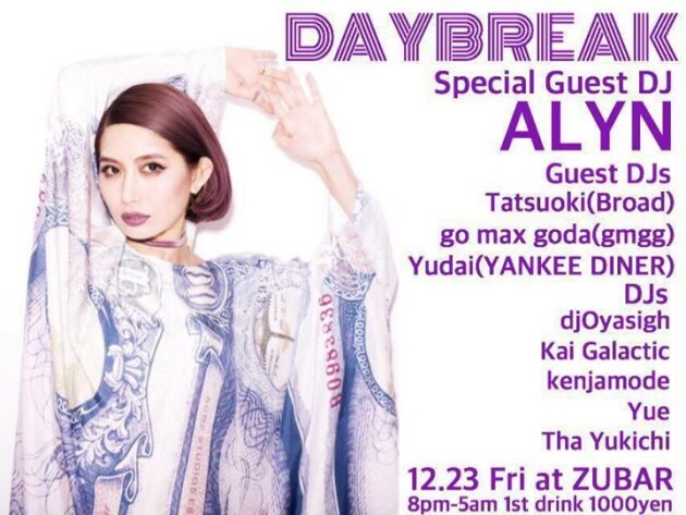 そして、今年最後のDAYBREAKを締めくくるSpecial Guest DJはALYNです。クラブシーンで活躍する彼女が頭バーのフロアーをジャックし、最高の盛り上がりを見せてくれることでしょう。