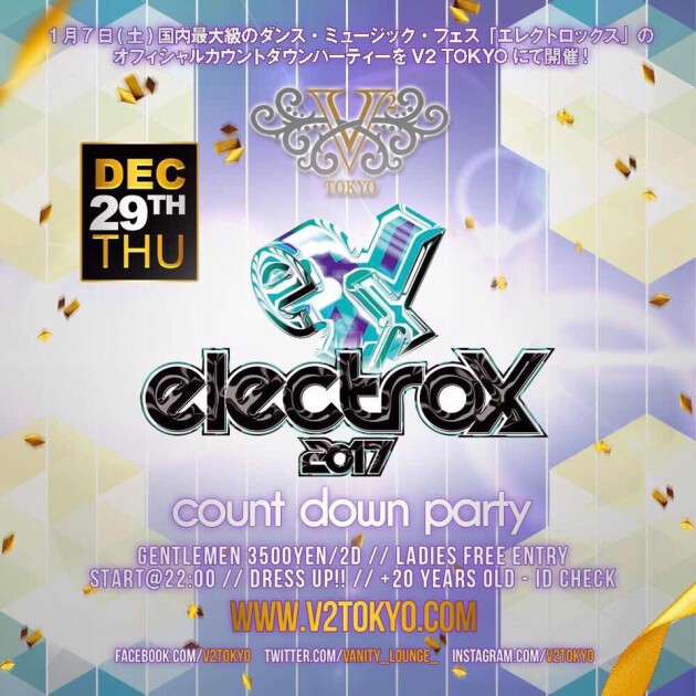 1/7(土)幕張メッセにて開催される『electrox』のCountDownPartyを12/29(木)V2 TOKYOにて開催決定!!
