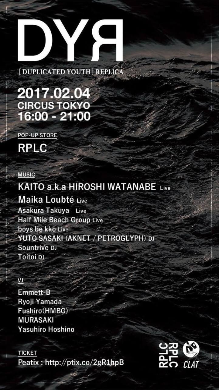 2017/2/4 に CIRCUS で開催される第一回のコンセプトテーマは [DUPLICATED YOUTH] REPLICA DUPLICATED(複製された・模写された)YOUTH(若さ・青春)。いつの時代も世代を超えて共鳴・ 共感し合う若さがある。そんな普遍的な若さ・青春を同パーティーに集合し融合することをテーマに 掲げる。初回ゲストは Maika Loubté とKAITO aka HIROSHI WATANABE。 当日はパーティーのコンセプトに合わせて RPLC のポップアップストアも開催。