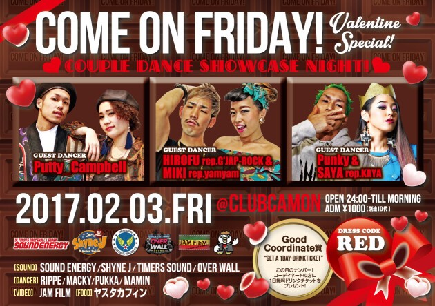 【COME ON FRIDAY!】2/3(金)☆毎月第1金曜開催『カモフラ』Valentine Special★★COUPLE DANCE SHOWCASE NIGHT☆☆GUEST DANCERにPutty_Campbell、HIROFU rep.G’JAP-ROCK & MIKI rep.yamyam、Punky & SAYA rep.KAYAが登場★★DRESS CODEはRED☆☆Good Coordinate賞としてこの日のNo.1コーディネートの方は朝まで飲み放題★★