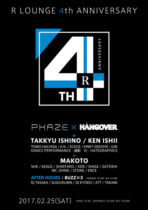 R Lounge 4th ANNIVERSARYの最終日を飾るのは毎週水曜日にR Loungeにて開催しているテクノ&ハウスパーティ『PHAZE』とドラムンベースシーンに新しいバイブを提供し続けている『HANGOVER』をフィーチャー。