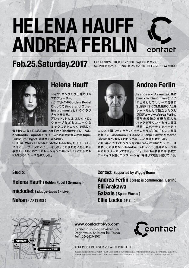 Ninja Tune傘下のWerk Discsや、PANといった先鋭レーベルのカタログに名を連ねながら、2017年からはBBC Radio 1のレジデントに抜擢された才媛Helena Hauffと、90年代初期から世界中のアンダーグラウンド・シーンで活躍を続け、Richie HawtinやMarco Carolaなどのビッグネームと共演を果たしてきたベテランAndrea FerlinがContactで一堂に会する一夜。Studio Xに登場するHelena Hauffは、エレクトロ、アシッド、EBM、インダストリアルなどの幅広い音をユニークなテクニックで混合させながら冒険的な空間を構築するDJスタイルを得意とする。sludge-tapes主宰のmiclodietによる実験的ながらフロアライクなライヴと、数多の現場を知るNehanのグルーヴとの邂逅には期待が高まる。一方、Wiggle RoomがサポートするContactフロアに登場するAndrea Ferlinは、長いキャリアに裏打ちされた職人技でタイトかつミニマルにフロアを奥深くへと導くだろう。「テクノ遠足」なるコンセプトのパーティーにてレジデントを務めるElli ArakawaとGalaxis、シドニーのFBI Radioを経て昨年から日本を拠点としているEllie Lockeとの共演も必見だ。