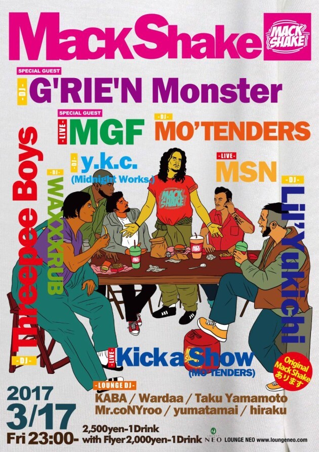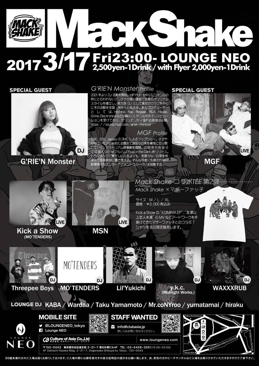 会場限定のマザーファッ子のオリジナルデザインTシャツやおいし〜シェイクも有るから、、3/17(金)は渋谷のNEOに来てよね!