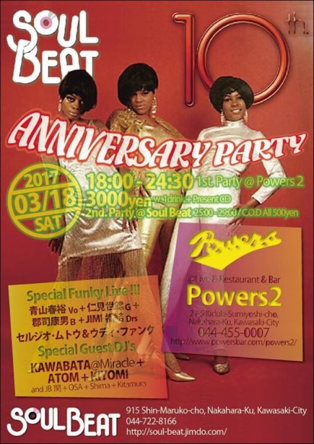 武蔵小杉にあるSOULBAR SOUL BEATの10周年パーティです! 青山春裕・WODDY FUNK・セルジオ ムトウ...豪華ラインナップのLIVE!!
