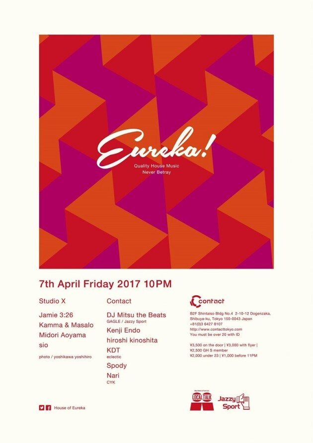 2016年から本格的にレーベルを始動し、バイナルのリリースも好調なEUREKA!が満を持してContacでパーティーを初開催。メインフロアのStudio Xには、18歳でシカゴの伝説的なクラブA.K.A.’sにて初のレジデントDJとして抜擢されて以来、長きに渡りシカゴのアンダーグラウンドシーンのアイコン的な存在であるJamie 3:26が3年ぶりに来日する。さらにはアムステルダムにてパーティーBrighter Daysを主宰し、近年飛ぶ鳥を落とす勢いでヨーロッパのアンダーグラウンドシーンにその名を轟かせているKamma & Masaloも招聘。またContactフロアにはJazzy Sport所属のビートメイカー、DJ、プロデューサー、リミキサーとして幅広く国内外で活躍するDJ Mitsu the Beatsを迎え撃つ。各フロアで脇を固めるローカルDJたちも一切抜け目なく、様々なキャリア/バックグラウンドに由来する個性的なプレイで全てのクラウドを歓喜の渦に巻き込むべく針を落とすことだろう。ハウスを中心に様々な音楽がクロスオーバーする夜、ぜひ足を運んでその耳と体で体感して欲しい。