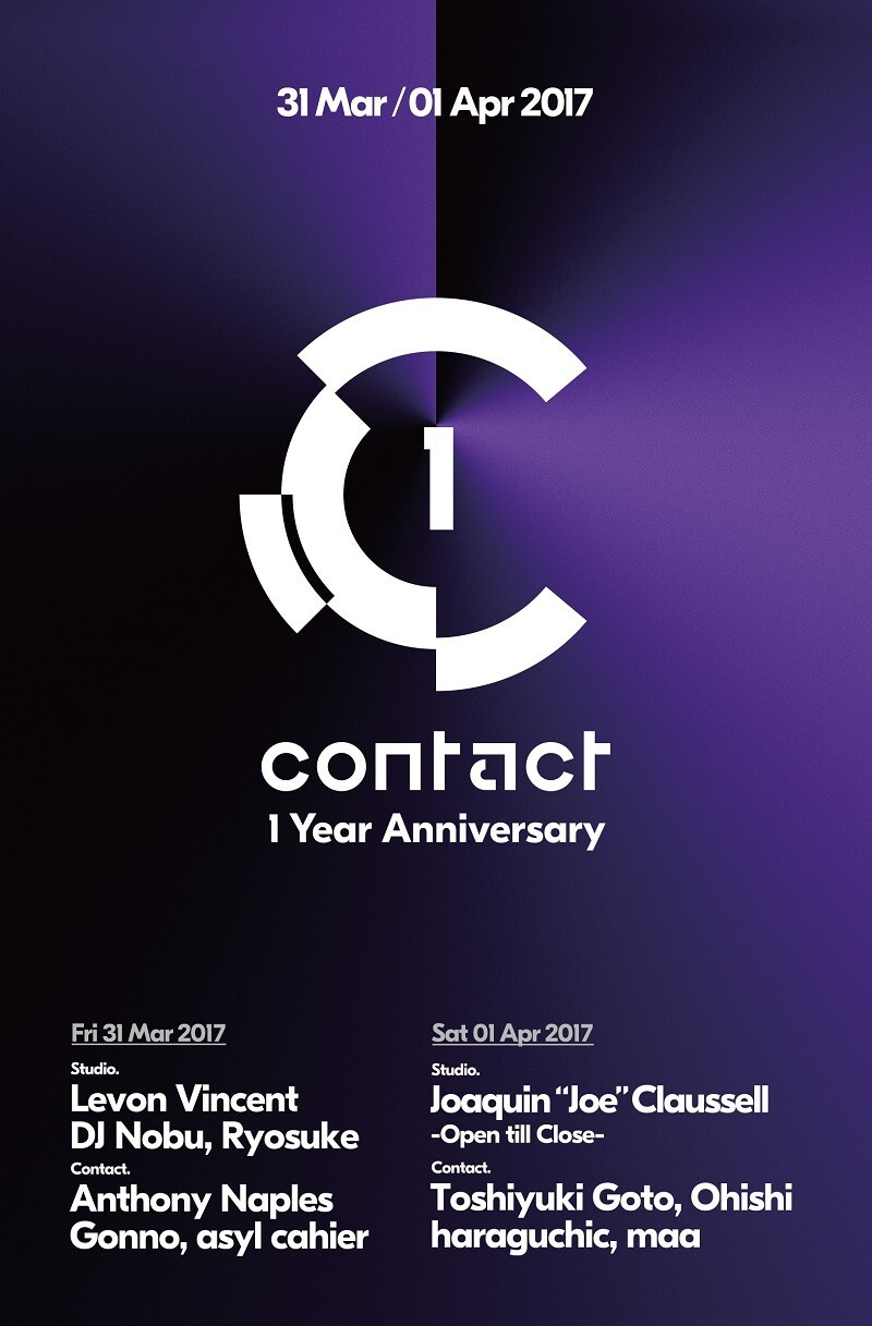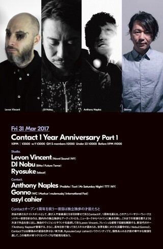渋谷の新たなナイトスポットとして、遊び人や音楽通たちを引き寄せてきたContactが、1周年を迎える。このアニバーサリー・ウィークエンドの一夜目を彩るのは、国内外の独立独歩なアーティストたち。ニューヨークからベルリンに拠点を移し、これまでの常識を覆すような方法で作品を世に出し、独自のヴィジョンとサウンドを追求してきたLevon Vincent。フレッシュな感性で伝統を刷新する、新世代のホープAnthony Naplesが登場する。さらに、長年日本で培ってきたスキルが認められ、世界を股にかけ大活躍中のDJ NobuとGonnoと、Contactではお馴染みの妥協を許さない実力派、Ryosukeとasyl cahierというラインナップだ。個性あふれる才能の華やかな競演を通して、この場所が持つクリエイティブな可能性を祝おう。