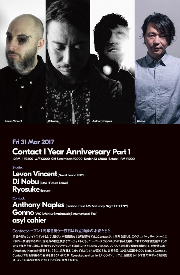 It has been a full year since Contact introduced itself to be clubbers’ and music heads’ new destination in Shibuya. The first night of its anniversary weekend has a cast of visionary artists. Hailing from New York now based in Berlin, Levon Vincent is a notable figure who has been challenging many conventions of the dance music world. He will be joined by the next-generation freshness Anthony Naples, who has been renovating the NYC’s dance traditions. Our own international stars DJ Nobu and Gonno will bring their world-class skills to the celebration, and so will the Contact’s favourite performers Ryoshuke and asyl cahier. Let this gathering of the top talents a night to remember in honour of this space for creativity.