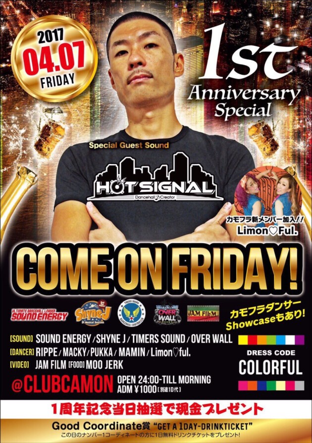 【COME ON FRIDAY! -1st ANNIVERSARY-】4/7(金)☆毎月第1金曜開催『カモフラ』1周年記念SPECIAL★★SPECIAL GUEST SOUNDにHOT SIGNALが登場☆☆1周年記念当日抽選で現金プレゼント★★DRESS CODEはカラフル☆☆Good Coordinate賞としてこの日のNo.1コーディネートの方は朝まで飲み放題★★