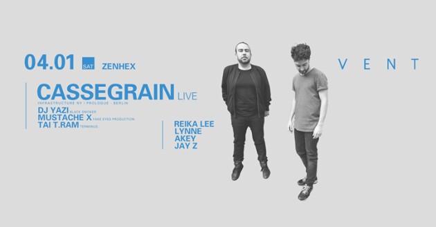 From Berlin deep techno circle , With a label résumé that includes, Prologue, Infrastructure New York, Killekill, and Ostgut Ton and highly regarded performances at Berghain, Village Underground, and Outputup the up and coming duo "Cassegrain" coming to Japan for a Live show at Vent .