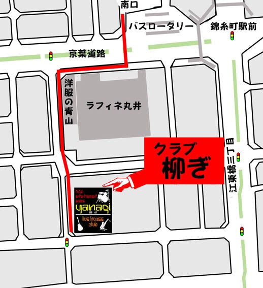 JR錦糸町駅南口を出て、京葉道路を渡り右折、丸井デパート→洋服の青山先交差点を左折、交差点2つめ左角、約5分。