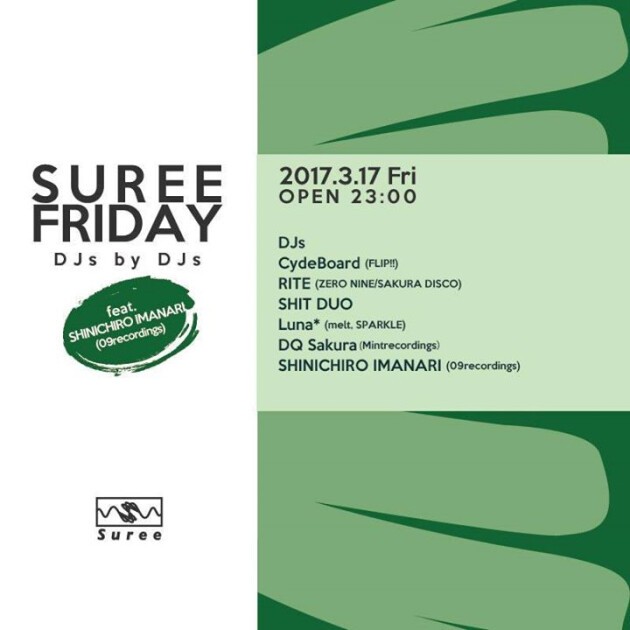 恵比寿Suree、金曜日のNEW PARTY "SUREE FRIDAY" 様々なシーンで活躍するDJ達が「今一緒に集まりたい」メンバーを選りすぐってお届けする"by the DJs"パーティ。