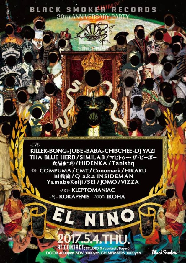 blacksmokerが20周年をむかえる。このアヴァン・ヒップホップ・レーベル=黒煙集団がこの20年間で成し遂げてきたことは唯一無二だ。ダンス・ミュージック、ノイズ、アヴァンギャルド、ジャズ、レゲエ、ロック……との交配、あるいはオペラの上演やギャラリーでのグループ展の開催。DJは元よりあらゆるジャンルのクリエイターをフィーチャーしたMIXCDシリーズは名物となった。ヒップホップに軸足を置き、音楽/アートの自由かつ野蛮な表現をとことん追求してきた。blacksmokerのような、ハードコアかつフリーキーに進化しつづけるレーベルは世界のどこを見渡してもない。マジで偉大だ。より多くの人たちにblacksmokerの漆黒の真髄に触れて欲しいと彼らに関わった人間ならば誰もが願う。20周年は絶好の機会だ。1997年にスタートしたELNINOはblacksmokerの原点となるパーティ/イベント(初期はあのOrgan Barで毎週狂乱の宴をくり広げていたというから恐るべし!)。20周年を祝うのにふさわしい豪華なアクトが揃った。メインのライヴは、KILLER-BONG×JUBE×BABA×YAZI×CHI3CHEE(“ほぼほぼ”THINK TANKということだ!)、THA BLUE HERB、SIMI LABの3組。この共演は日本のラップシーンにとっても小さくない出来事だ。さらにblacksmokerに縁の深い個性的なDJやアーティスト、ダンサーらが続々と登場する。フードも出るし、ライヴ・ペインティングもある