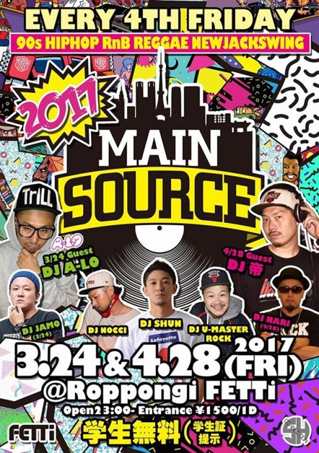 90年代クラシックを六本木で浴びる!毎月第4金曜日はMainsource@六本木fetti!3月のゲストにはDJ A-Lo!4月は横浜からDJ 帝が登場!