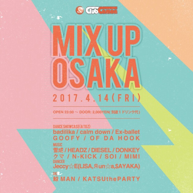 【MIX UP OSAKA】4/14(金)☆偶数月第2金曜開催『MIX UP OSAKA』☆☆DANCE SHOWにbadilika、calm down、Ex-ballet、GOOFY、OF DA HOOKが登場★★