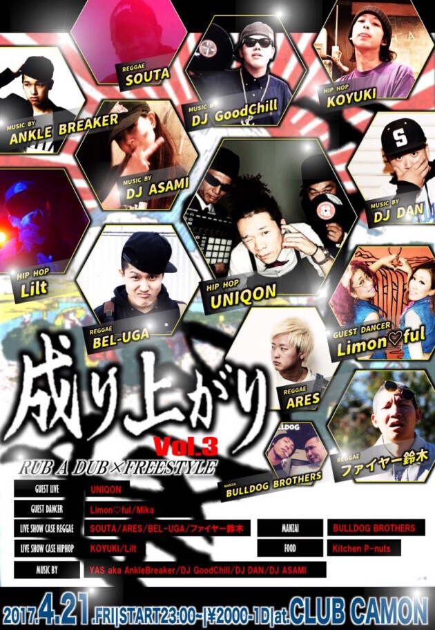 【成り上がり vol.3】4/21(金)☆偶数月第3金曜開催『成り上がり』★★GUEST LIVEにUNIQON、GUEST DANCERにLimon♡ful.、Mikaが登場☆☆漫才やFOODブースも出店★★