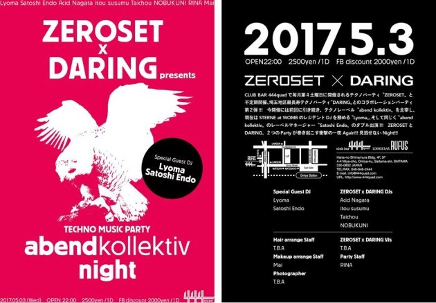 CLUB BAR 444quadで毎月第4土曜日に開催されるテクノパーティ”ZEROSET”と不定期開催、埼玉地区最長寿テクノパーティ”DARING”とのコラボレーションパーティ第2弾!!!