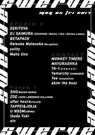 これからのミュージック&カルチャーシーンを担うアーティストが多数集結し開催されるパーティー"SWERVE"。一晩を通して彩られるテクノの祭典を是非体感してほしい。Contactラウンジでは、ダブディスコ以降のカルチャーが成熟を経た後の2000年代からキャリアをスタートした新世代を担う実力派DJデュオMonkey Timersが登場する。