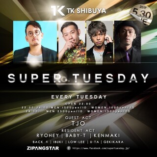 東京の遊びの中心「渋谷」の新たな遊び場「TK SHIBUYA」が、毎週火曜日に開催するパーティー「SUPER TUESDAY」!この「スパチュー」ではEDMは勿論、HIP HOPやベースMUSIC等、今、世界で主流の音楽がジャンルレスに体感できる!豪華なレギュラーDJ陣に加え毎週多彩なゲストDJを招き、他の平日では味わえない最高の夜をお楽しみ頂けます!