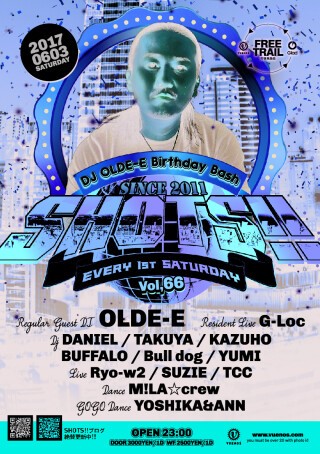 伝説のクラブ“VUENOS TOKYO”が閉店後、 始まったDJ OLDE-E (NAGOYA) のレギュラーゲストパーティー「SHOTS!!」が5年目に突入!! DJ OLDE-Eもスクリーンを使い、音と映像がリンクする「VDJ」とマイクパフォーマンスでVUENOSを盛り上げます! 東西のリアルHIP HOPを織り交ぜ、初心者から玄人まで誰でも楽しめるONE AND ONLY PARTY!! プレイ中には、振る舞いテキーラが飛び交い、パーティーモード全開! 最先端のHIP HOPをチェックしたければ、SHOTS!!で决まり!!
