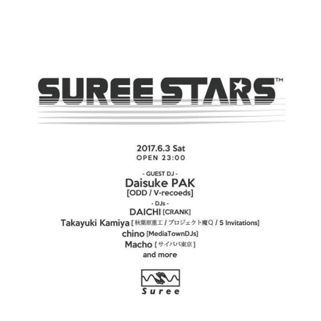 様々なシーンで活躍するDJ陣を迎えてお送りする、毎月第1土曜のレギュラーパーティ”SUREE STARS” 今月は長年のベルリンでの活動を経て帰国したDaisuke PAK (ODD / V-recoeds)をゲストに迎えて開催。