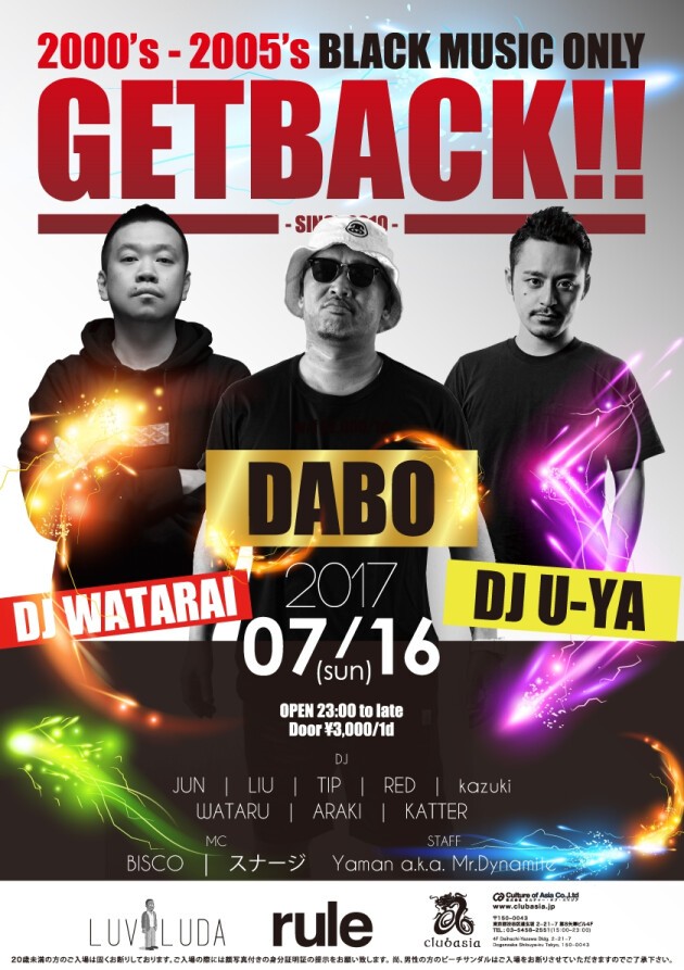 今回もGUEST LIVE DABO、GUEST DJ WATARAIと間違いないGUEST陣、そしてRESIDENT DJ U-YAを中心としたレギュラーメンバーも脇を固めます。