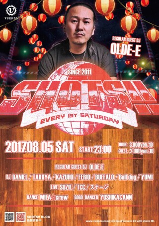 伝説のクラブ“VUENOS TOKYO”が閉店後、 始まったDJ OLDE-E (NAGOYA) のレギュラーゲストパーティー「SHOTS!!」が5年目に突入!! DJ OLDE-Eもスクリーンを使い、音と映像がリンクする「VDJ」とマイクパフォーマンスでVUENOSを盛り上げます! 東西のリアルHIP HOPを織り交ぜ、初心者から玄人まで誰でも楽しめるONE AND ONLY PARTY!! プレイ中には、振る舞いテキーラが飛び交い、パーティーモード全開! 最先端のHIP HOPをチェックしたければ、SHOTS!!で决まり!!