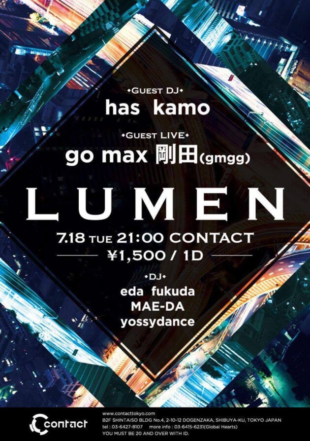 初回のゲストには、clubasiaなどで開催されているモンスターパーティーBOUNCE UP主催has、代官山saloonでお馴染みkamo、バンド・DJ・占い師・バーテンとして各所で大活躍中のgo max 剛田を迎え、池尻~下北沢発「BAR TAKASHI」クルーが平日contactの夜をエスコートする。
