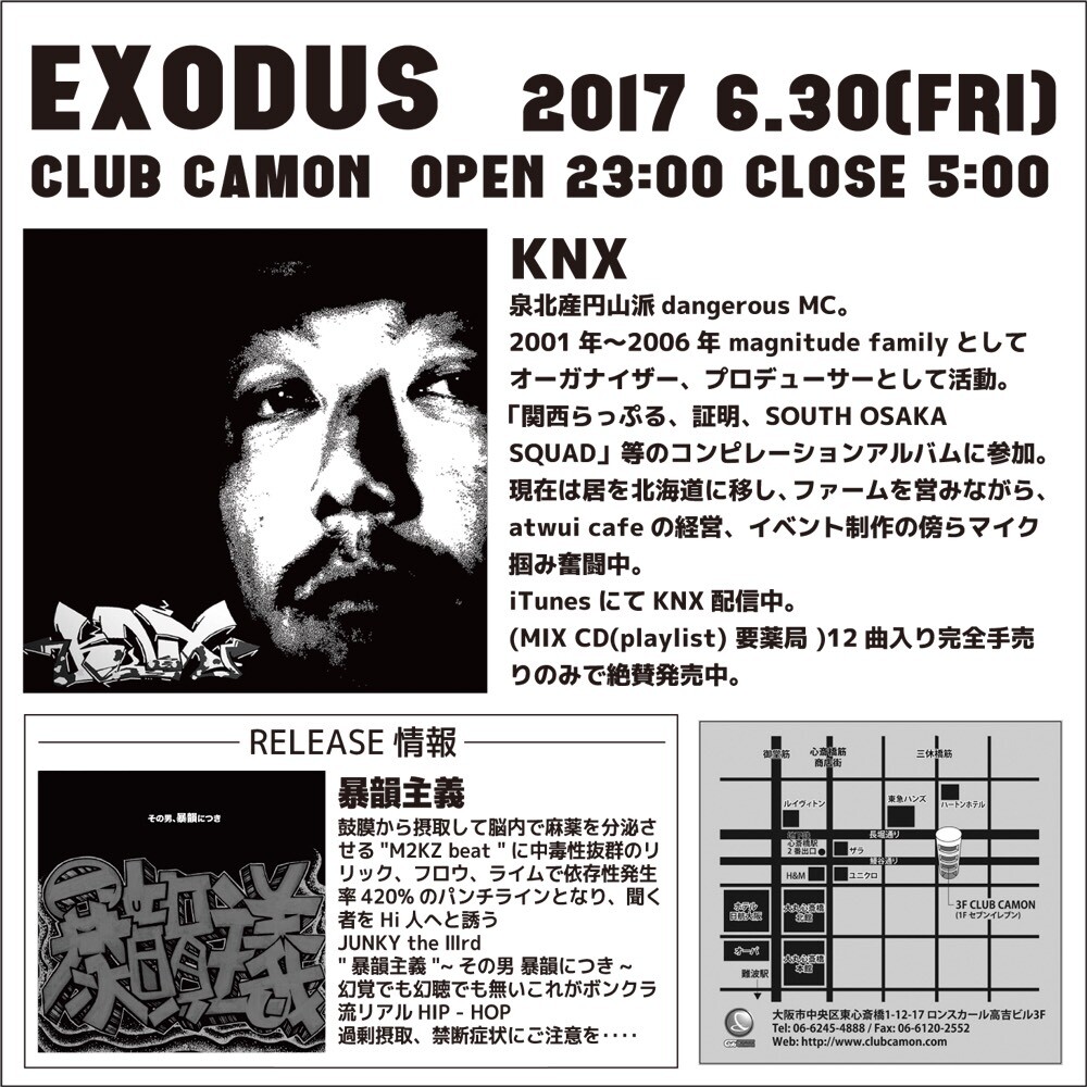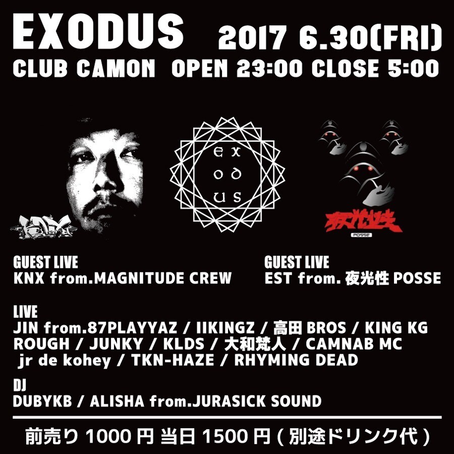 【EXODUS vol.2】6/30(金)☆第5金曜開催『EXODUS』の第2弾★★GUEST LIVEにKNX from MAGNITUDE CREW、EST from 夜光性POSSEが登場☆☆HIP HOPアーティスト多数登場★★