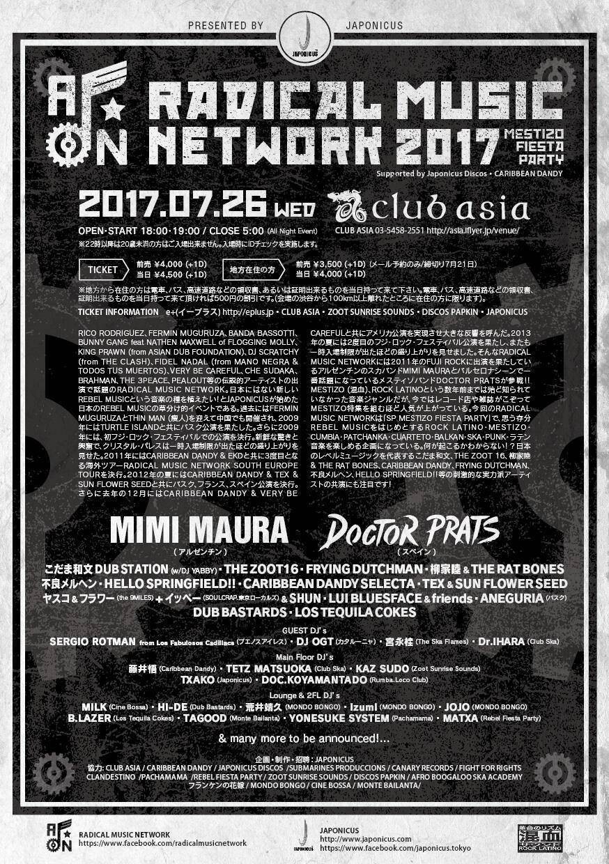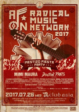 RICO RODRIGUEZ、FERMIN MUGURUZA、BANDA BASSOTTI、BUNNY GANG feat NATHEN MAXWELL of FLOGGING MOLLY、KING PRAWN (from ASIAN DUB FOUNDATION)、DJ SCRATCHY (from THE CLASH)、FIDEL NADAL (from MANO NEGRA & TODOS TUS MUERTOS)、VERY BE CAREFUL、CHE SUDAKA、BRAHMAN、THE 3PEACE、PEALOUT等の伝説的アーティストの出演で話題のRADICAL MUSIC NETWORK。日本にはない新しいREBEL MUSICという音楽の種を植えたい!とJAPONICUSが始めた日本のREBEL MUSICの草分け的イベントである。過去にはFERMIN MUGURUZAとTHIN MAN (痩人)を迎えて中国でも開催され、2009年にはTURTLE ISLANDと共にバスク公演を果たした。さらに2009年には、初フジ・ロック・フェスティバルでの公演を決行。新鮮な驚きと興奮で、クリスタル・パレスは一時入場制限が出たほどの盛り上がりを見せた。2011年にはCARIBBEAN DANDY & EKDと共に3度目となる海外ツアーRADICAL MUSIC NETWORK SOUTH EUROPE TOURを決行。2012年の夏にはCARIBBEAN DANDY & TEX & SUN FLOWER SEEDと共にバスク、フランス、スペイン公演を決行。さらに去年の12月にはCARIBBEAN DANDY & VERY BE CAREFULと共にアメリカ公演を実現させ大きな反響を呼んだ。2013年の夏には2度目のフジ・ロック・フェスティバル公演を果たし、またも一時入場制限が出たほどの盛り上がりを見せました。そんなRADICAL MUSIC NETWORKには2011年のFUJI ROCKに出演を果たしているアルゼンチンのスカバンドMIMI MAURAとバルセロナシーンで一番話題になっているメスティソバンドDOCTOR PRATSが参戦!! MESTIZO (混血)、ROCK LATINOという数年前までは殆ど知られていなかった音楽ジャンルだが、今ではレコード店や雑誌がこぞってMESTIZO特集を組むほど人気が上がっている。今回のRADICAL MUSIC NETWORKは「SP MESTIZO FIESTA PARTY」で、思う存分REBEL MUSICをはじめとするROCK LATINO・MESTIZO・CUMBIA・PATCHANKA・CUARTETO・BALKAN・SKA・PUNK・ラテン音楽を楽しめる企画になっている。何が起こるかわからない!?日本のレベルミュージックを代表するこだま和文、THE ZOOT 16、柳家睦 & THE RAT BONES、CARIBBEAN DANDY、FRYING DUTCHMAN、不良メルヘン、HELLO SPRINGFIELD!!等の刺激的な実力派アーティストの共演にも注目です!