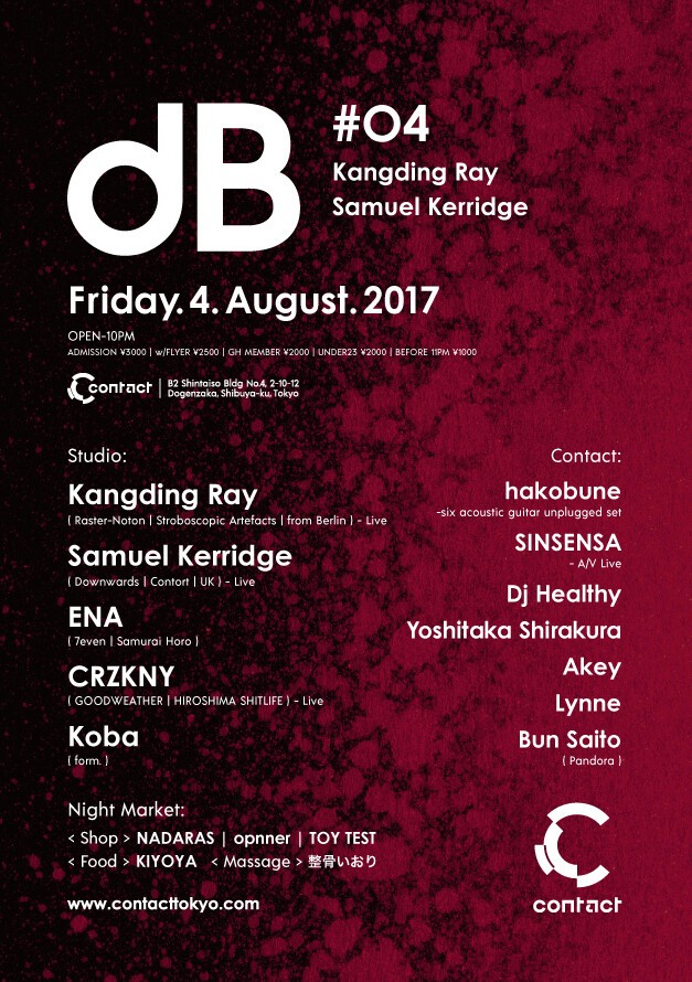 ライブパフォーマンスを主軸にすえた新感覚のクラブイベントdB。DJによる空間づくりとは違った視点から構築されるこのイベントには、国内外問わず個性豊かなアーティストが集ってきた。他人の楽曲をその場に合わせてミックスするDJに対し、自ら緻密にデザインしたサウンドと入念に準備した構成でフロアに対峙するライブパフォーマンスには、プロデューサーの個性がよりダイレクトに投影される。そうした個と個がぶつかり合うdBが濃厚な音楽体験を味わえる場所となっているのは、過去の開催で証明済みだ。第4回目の開催となる今回には、音響技術者として培った精密なサウンドデザインを漆黒のテクノグルーヴに落とし込むKangding Rayが出演。強烈なノイズとダンスフロアを結びつける前衛音楽家Samuel Kerridgeや、インダストリアルとフットワークを融合した新境地を切り開くCRZKNYなど、鼓膜をかなぐる攻撃的なアクトが並ぶ一方で、意識ににじむような柔らかなアンビエントサウンドで知られるHakobuneが6人編成のアコースティックギター・ライブで参加し、極上のコントラストを演出。好評を得ているマーケットエリアには今回もバラエティに富む店舗が出店し、音楽以外にも彩りを添える。
