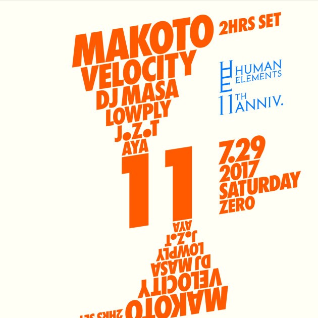 Long run musical / Soulful Drum&Bass night in Tokyo – Human Elements. We are glad to say that we will turn 11 years old on 29th July 2017. Tokyo’s one & only Makoto who has just come back from UK / Europe will be doing 2hrs set which is quite rare in his home town Tokyo. His 4th solo album will be released on the Hospital Records in this summer, so expect some of new material from his forthcoming album. The line up goes on strong with our residents to celebrate 11 years, we have Velocity who recently has got picked his collaboration track called "Set It Out" with Satl for Drum & Bass Area 2017, also DJ Masa who won “Road to Outlook” in 2014 and is making regular appearance at 06s at the womb club and our amazing residents Lowply, JZT and Aya.