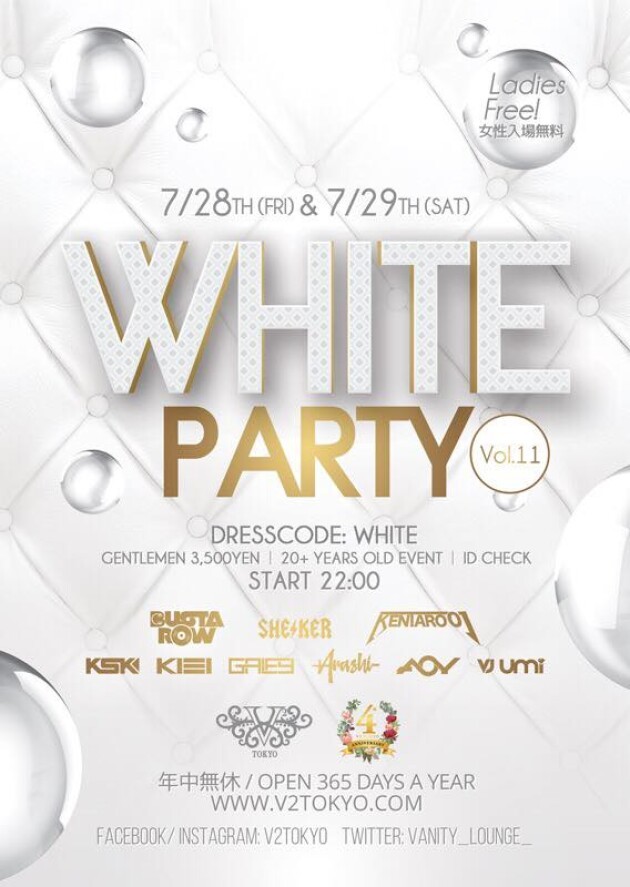 7/28(金)29(土)は『V2TOKYO 4TH ANNIVERSARY×WHITE PARTY Vol.11』を開催!